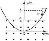 22.如图所示,一形状为抛物线的光滑曲面轨道置于竖直平面内,轨道的下半部处在一个水平向外的磁场中,磁场的上边界是