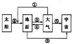 右图中各箭头及其代表符号①、②、③、④、⑤表示太阳、地面、大气、宇宙空间之间的热力作用,其中包括太阳辐射、地面辐射、大气辐射、大气逆辐射、大气对太阳辐射的削弱作用(吸收、反射和散射)。读图回答下面21-23题。
