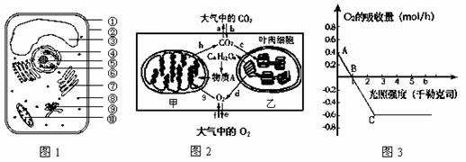 31.(12分)下图表示了某一绿色植物的一些结构、生理的情况。其中图1表示某一细胞的结构,图2表示某绿色植物叶肉细胞中的两种细胞器之间的关系,图3表示该植物光合作用强度与光照强度之间的关系。请据图分析回答: