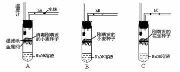 (5)在右图密闭装置中,分别放入质量相等的消毒且刚萌发的小麦种子、刚萌发的小麦种子及刚萌发的花生种子,把三套装置放在隔热的且适宜条件下培养,A和B玻璃管中的水珠开始移动时速率分别为VA和VB,则VA VB;如果B和C中都消耗了等质量的有机物,温度计读数为TC TB。