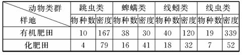 解析 从表中给出的数据可以看出,有机肥田中的土壤动物种类繁多,营养结构复杂,其中物种数远远大于化肥田。使用有机肥,可为土壤生物提供更多的有机营养,有利于土壤生物的大量繁殖,从而增加生物的多样性。同时异养微生物的大量繁殖,使土壤有机物分解成无机物(有机物质减少),长期使用化肥,可导致土壤板结,生物多样性降低。