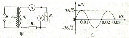 17.如图甲所示,理想变压器原线圈接图乙所示的正弦交流电,副线圈与理想电压表、理想电流表、热敏电阻Rt(阻值随温度的升高而减小)及定值电阻R1组成闭合电路。则以下判断正确的是 ( )