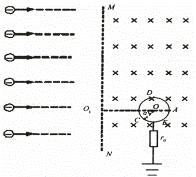 所在直线与圆筒右侧壁交于A 点。圆筒通过导 线和电阻r0 接地。现有范围足够大的平行电子束以相同的速度从很远处垂直于MN向右射入磁场区。当金属圆筒最初不带电时,发现电子只能射到圆筒上以A 点和C 点为界的ADC 弧上,而AEC 弧上各点均不能接收到电子;当圆筒上电荷量达到相对稳定后,通过电阻r0 的电流恒为I 。已知电子质量为m,电荷量为e ,忽略运动电子间的相互作用,取大地或无穷远处电势为零。求: