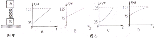 21.如图甲所示,水平地面上质量均为5kg的两木块A、B用一轻弹簧相连接,整个系统处于静止状态。现用一竖直向上的力F拉木块A,使木块A向上做加速度为5m/s2的匀加速直线运动。在力F刚作用在木块A的瞬间到木块B刚离开地面的瞬间这一过程中,图乙中能正确表示力F与木块A的位移