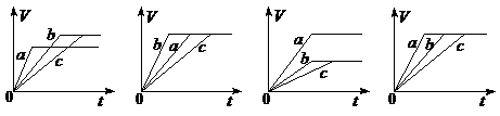 20.常温下,在a、b、c三个盛有相同体积、相同浓度的稀H2SO4的烧杯中,分别加入等质量的表面积相同的锌。然后在a中同时加入适量CuSO4溶液,c中加入适量的无水CH3COONa固体。下列各图中表示其产生氢气总体积(V)与时间(t)的关系,其中可能正确的是 ( )