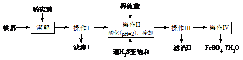 绿矾(FeSO4·7H2O)是治疗缺铁性贫血药品的重要成分。下面是以市售铁屑(含少量锡、氧化铁等杂质)为原料生产纯净绿矾的一种方法: