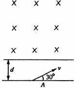 如图所示宽度为d的区域上方存在垂直纸面、方向向内、磁感应强度大小为B的无限大匀强磁场,现有一质量为m,带电量为+q的粒子在纸面内以某一速度从此区域下边缘上的A点射入,其方向与下边缘线成30°角,粒子能回到A点,(不计重力)试求:
