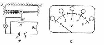 25.(18分)“加速度计”作为测定运动物体加速度的仪器,已被广泛应用,图甲所示为应变式加速度计的原理图:支架AB固定在待测系统上,滑块穿在AB之间的水平光滑杆上,并用轻弹簧连接在A端,其下端有一活动臂可在滑动变阻器上自由滑动.随着系统沿水平方向做变速运动,滑块相对于支架将发生位移,并通过电路转换成电信号从电压表输出.已知电压表量程为8V,滑块质量m=0.1kg,弹簧劲度系数k=20N/m,电源电动势E=10V,内阻不计,滑动变阻器总电阻值R=40Ω,有效总长度l=8cm.当待测系统静上时,滑动触头P位于变阻器R的中点,取A→B方向为速度正方向.