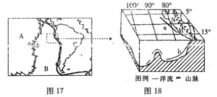 (2)图17中A、B、C三个板块中几乎全部是海洋的是 板块,图18所示N国多地震的主要原因是该国位于板块 (消亡或生长)边界处。