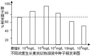 (3)有位同学对实验结果分析,得出的结论是:生长素类似物溶液较低浓度时促进种子萌发,较高浓度时抑制种子萌发。请你绘制直方图把该同学可能出现的一种实验结果直观地表示出来。