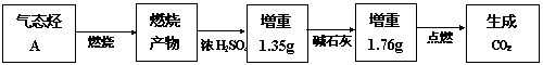 (12分)为测定一种气态烃A的化学式,取标准状况下一定体积的A置于密闭容器中,再通入一定体积的O2 ,用电火花引燃,定性实验表明产物是CO2、CO、水蒸气。相关方案及有关数据如下(图中的箭头表示气体的流向,试验前系统内的空气已排除),