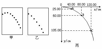如图丙所示(O点不是抛出点),x轴沿水平方向,由图中所给的数据可求出平抛物体的初速度大小是_______m/s,抛出点的坐标为x=________cm,y=__________cm。(g取10m/s2)。