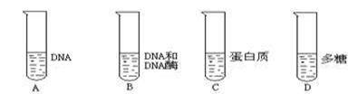 如下图所示,肺炎双球菌转化实验中,在培养有R型细菌的A、B、C、D四支试管中,一次分别加入从S型细菌中提取的DNA、DNA和DNA酶、蛋白质、多糖,经过培养,检查结果发现有R型细菌转化的是