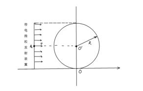 方法一:从任一点P水平进入磁场的带电微粒在磁场中做半径为R的匀速圆周运动,其圆心位于其正下方的Q点,如图b所示,这束带电微粒进入磁场后的圆心轨迹是如图b的虚线半圆,此圆的圆心是坐标原点为。