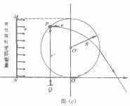 带电微粒在磁场中经过一段半径为r′的圆弧运动后,将在y同的右方(x>0)的区域离开磁场并做匀速直线运动,如图c所示。靠近M点发射出来的带电微粒在突出磁场后会射向x同正方向的无穷远处国靠近N点发射出来的带电微粒会在靠近原点之处穿出磁场。
