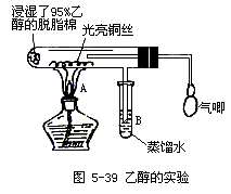 (1)甲同学其实验操作为:预先使棉花团浸透乙醇,并照图5-39装置好实验装置;在铜丝的中间部分加热,片刻后开始有节奏(间歇性)地鼓入空气,即可观察到明显的实验现象。
