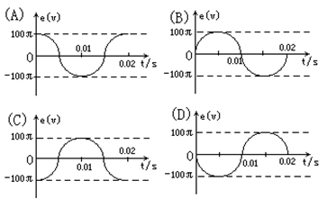 12、一个匝数N=100匝的平面线圈所包围的面积S=0.02m2,在匀强磁场B=0.5T中绕垂直于磁感线的轴以角速度ω=100πred/s匀速转动时,在线圈中产生交流电,若自线圈通过中性面时开始计时,那么在图中能够反映线圈中感应电动势随时间变化的图像是 [ ]