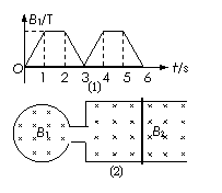 在水平桌面上,一个面积为S的圆形金属框置于匀强磁场中,线框平面与磁场垂直,磁感应强度B1随时间t的变化关系如图⑴所示.0~1s内磁场方向垂直线框平面向下.圆形金属框与一个水平的平行金属导轨相连接,导轨上放置一根导体棒,导体棒的长为L、电阻为R,且与导轨接触良好,导体棒处于另一匀强磁场中,其磁感应强度恒为B2,方向垂直导轨平面向下,如图⑵所示.若导体棒始终保持静止,则其所受的静摩擦力f随时间变化的图象是下图中的(设向右为静摩擦力的正方向)