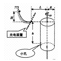 (16分)如图,小球从光滑的斜轨道下滑至水平轨道末端时,光电装置被触动,控制电路会使转筒立刻以某一角速度匀速连续转动起来(转筒的底面半径为R)。已知轨道末端与转筒上部相平,与转筒的转轴距离为L,且与转筒侧壁上的小孔的高度差为h。开始时转筒静止,且小孔正对着轨道方向。现让一小球从斜轨上的某处无初速滑下,若正好能钻入转筒的小孔(小孔比小球略大,小球视为质点,不计空气阻力,重力加速度为g),求: