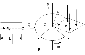 (21分)如图甲所示,半径为r的金属圆环水平放置,三条电阻均为R的导体棒Oa、Ob、和Oc互成1200角连接在圆心O和圆环上,圆环绕经过圆心O的竖直金属转轴以大小为ω的角速度按图中箭头方向匀速转动。一方向竖直向下的匀强磁场区与圆环所在平面相交,相交区域为如图虚线的菱形(顶角为600的那个顶点位于O处、其它三个顶点在圆环外)。C为水平放置的平行板电容器,通过固定的电刷P和Q连接在圆环和金属转轴上,电容器极板长为L,两极板的间距为d。现使一细电子束沿两板间的中线以大小为vO(vO=