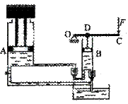(09宁夏卷) (2)(10分)液压千斤顶是利用密闭容器内的液体能够把液体所受到的压强行各个方向传递的原理制成的。图为一小型千斤顶的结构示意图。大活塞的直径D1=20cm,小活塞B的直径D2=5cm,手柄的长度OC=50cm,小活塞与手柄的连接点到转轴O的距离OD=10cm。现用此千斤顶使质量m=4×103kg的重物升高了h=10cm。g取10m/s2,求