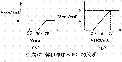 23、(14分)取等物质的量浓度的NaOH溶液两份,每份50mL。向其中各通入一定量的C02,随后分别各取溶液10mL,将其稀释成100mL溶液,并分别向稀释后的溶液中逐滴加入0.1mol·L-1的盐酸,产生的CO2气体体积(标准状况)与所加入盐酸的体积之间的关系如图所示:(设分别为A、B两种情况)