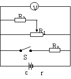 如图所示,若R1=4Ω,R3=6Ω,电池内阻r=0.6Ω,则电源产生的总功率为P总=40W,而输出功率为P出=37.6W. 求:电源电动势和电阻R2. (本题8分)