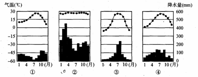 27. 下列四幅图中,表示热带雨林气候的气温和降水量特点的是![]()