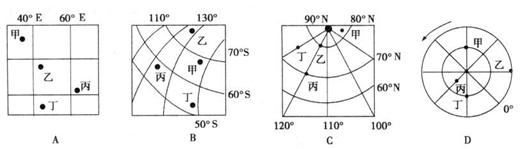 27.下列四幅图中,甲地在乙地西北、丙地在丁地东南的是( )