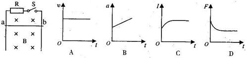 21.如图所示,两竖直放置的足够长的平行光滑导轨与电阻R连接后处于垂直于导轨平面的匀强磁场中,金属杆ab与导轨接触良好并可沿导轨,滑动,金属杆的电阻恒定,导轨的电阻忽略不计,最初开关S断开,让ab杆由静止开始下滑,经一段时间后闭合S.则从S 闭合开始计时,金属杆ab的速度v、加速度a、杆中的电流I、杆所受安培力F随时间t的关系图像如下图所示,其中不可能发生的是 ( )