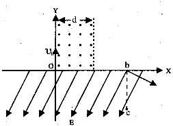 25.(18分)如图所示,在直角坐标系XOY的第一象限内有垂直于坐标平面向外的矩形有界匀强磁场,磁场的左边界与Y轴重合,右边界如图中虚线所示。在坐标系的三四象限内有平行于坐标平面、与X轴负方向成60°角斜向下的匀强电场,场强大小为E。一质量为m,电荷量为+q的粒子以速度v0从坐标原点O沿y轴正方向出发,经磁场作用后偏转,粒子飞出磁场区域经过x轴上的b点,此时速度方向与x轴正方向的夹角为30°,粒子随后进入匀强电场中,恰好通过b点正下方的c点。已知O、b两点间距为L,粒子的重力不计,试求: