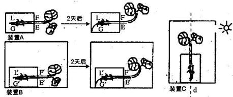 (3)在装置C中,若固定光源位置,让花盆和木箱一起绕d轴匀速转动,则一段时间后,箱内幼苗的生长状况是__________________________ 。