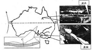 40. 2009年2月的澳大利亚,当东南部备受高温干旱和山林大火之苦时,东北部又遭受洪水侵袭,澳洲处在一片“水深火热”之中。读图回答下列问题。(共28分)