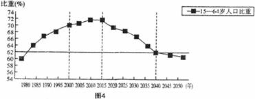 下图为中国劳动适龄人口(15-64岁)比重预测图,读图回答3-4题。