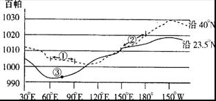 右图是某月份海平面平均气压沿两条纬线的变化图,回答5-6题。