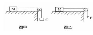 5. 质量为M的滑块放在光滑的水平台子上,用柔软的轻绳系住,绳子绕过固定在桌边的光滑定滑轮,如图所示。在图甲中,绳的另一端系着质量为m的砝码,在图乙中绳的另一端用恒力F向下拉,且