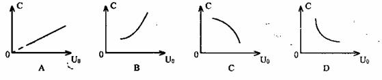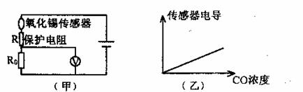 氧化锡传感器主要用于汽车尾气中一氧化碳浓度的检测。它的电阻随一氧化碳浓度的变化而变化,在如图(甲)所示的电路中,不同的一氧化碳浓度对应着传感器的不同电阻,这样,显示仪表的指针就与一氧化碳浓度有了对应关系,观察仪表指针就能判断一氧化碳浓度是否超标。有一种氧化锡传感器,其技术资料中给出的是电导(即电阻的倒数)一浓度曲线如图(乙)所示,请判断,电压表示数U。与一氧化碳浓度C之间的对应关系正确的是图中的 ( )