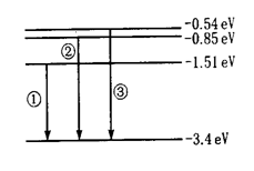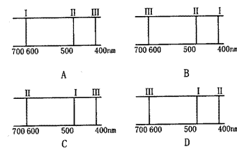 氢原子发光时,能级间存在不同的跃迁方式,其中①②③三种跃迁方式对应的光谱线分别为I、Ⅱ、Ⅲ,下列A、B、C、D光谱图中,与三种跃迁方式对应的光谱图应当是(图中下方的数值和短线是波长的标尺)