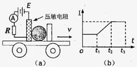 9.压敏电阻的阻值随所受压力的增大而减小,张明同学利用压敏电阻设计了判断小车运动状态的装置,其工作原理如图(n)所示,将压敏电阻和一块挡板同定在绝缘小车上,中间放置一个绝缘重球。小车向右做直线运动的过程中,电流表示数如图(6)所示,下列判断正确的是(A)
