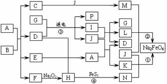 宜进行机械加工。已知:⑴E、F、H、I、P常温下为气体,H、I、P为单质,E是一种经棕色气体。⑵反应①②均为制备理想的绿色水处理剂Na2FeO4的方法,其中反应①在生成Na2FeO4的同时还生成NaNO2和H2O。各物质之间的转化关系如下图所示(图中部分生成物没有列出)。