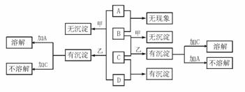 5. A、B、C、D分别代表硝酸银、偏铝酸钠、稀盐酸、浓氨水四种无色溶液中的一种。甲、乙两同学分别用两两混合的方法进行了如下图所示的实验,现象有的相同,有的不同,不同部分已标出。