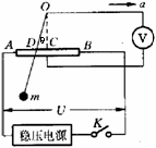 如图是某兴趣小组制作的一种测定水平风力的装置。质量为m的气球系在质量可忽略的细金属丝下端,金属丝上端固定在O点。AB是长为L的均匀电阻丝,阻值为R。金属丝和电阻丝接触良好,摩擦不计。AB的中点C焊接一根导线,从O点也引出一根导线,这两根导线之间接一个零刻度在中间的伏特表V,(金属丝和连接用导线的电阻不计)。图中虚线OC与AB垂直,OC=h,电阻丝AB两端接在电压为U的稳压电源上。整个装置固定,让水平的风直接吹到气球上。那么,从电压表的读数,就可以测出气球受的水平风力的大小。⑴写出水平风力大小F和金属丝偏转角θ间的关系式。⑵写出水平风力大小F和电压表读数U/的关系式。⑶该装置能测定的最大水平风力大小F是多大?