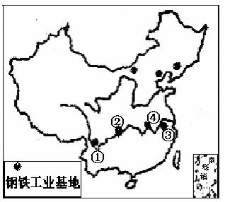 ⑴我国的“钢都”和“草原钢城”分别是指哪里?请用字母A和B在图中标出它们的位置。简要说明“钢都”的形成资源条件?