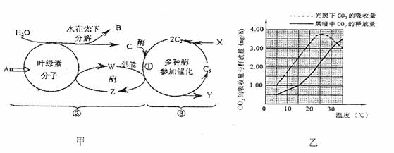 18.下图甲为光合作用过程示意图,乙为不同光照条件下温度对某植物CO2吸收与 释放量的影响图,A、B、C、W、X、Y、Z代表各种物质或能量,请据图回答下列问题: