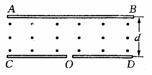 12、如图所示,在有限区域ABCD内有垂直于纸面向外的匀强磁场,磁场竖直高度为d,水平方向足够长,磁感应强度为B,在CD边界中点O有大量的不同速度的正、负粒子垂直射入磁场,粒子经磁场偏转后打在足够长的水平边界AB、CD上,请在AB、CD边界上画出粒子所能达到的区域并简要说明理由(不计粒子的重力)。