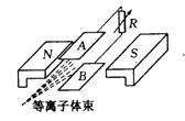 磁流体发电是一项新兴持术,它可以把气体的内能直接转化为电能,如图所示是磁流体发电机的装置,A、B组成一对平行电极,两板间距为d,内有磁感应强度为B的匀强磁场。现持续将一束等离子体(即高温下电离的气体,含有大量带正电和负电的微粒,而整体呈中性)垂直喷入磁场,每个离子的速度为v,电量大小为q,忽略两极之间的等效内阻,稳定时,电势较高的是哪个极?磁流体发电机的电动势多大?外电阻R上消耗的功率为多大?