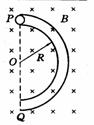 [例3]竖直放置的半圆形光滑绝缘管道处在图所示的匀强磁场中,B=1.1T,管道半径R=0.8m,其直径POQ在竖直线上,在管口P处以2m/s的速度水平射入一个带电小球(可视为质点),其电量为10-4C(g取10m/s2)试求: