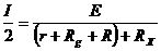 ,指针指中心刻度时,回路电流为I/2,此时被测电阻阻值为RX,则有![]()