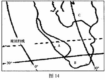 一艘满载石油的大型油轮从波斯湾出发,七月份从B点南端海域经过,经大西洋回到西欧,读图14,回答相关问题。