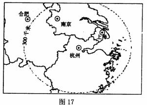 材料二:西湖位于杭州城西,三面环山,东面濒临市区。在以西湖为中心的60平方千米的园林风景区内,分布着主要风景名胜40多处,重点文物古迹30多处。1982年曲湖被确定为国家风号名胜区,1985年被评为“伸国十大风景名胜”之一.图17是“以杭州为中心300千米范围示意图”。